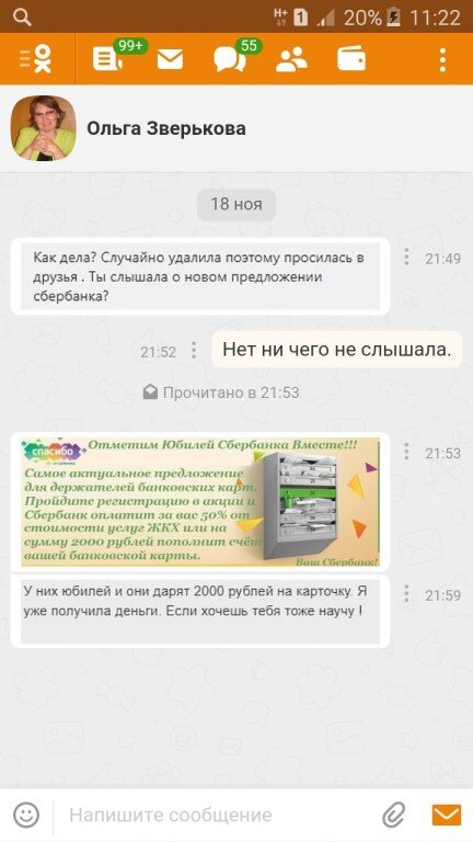 В этой статье я расскажу о популярных способах обмана в одноклассниках , которые необходимо знать . 1. К вам добавляется незнакомый человек , как правило, профиль у него оформлен (есть фотография , друзья) и начинает с вами общение , где говорит о какой-то невероятной новости от Сбербанка , о том , что у Сбербанка проходит акция или юбилей и они дарят от 2000 рублей на карту. Скорее всего вам даже пришлют оформленную картинку , с подробностями о данной акции. У вас опять же попросят данные карты , личные данные и тд. НИ В КОЕМ СЛУЧАЕ не ведитесь на такой развод . ЗАПОМНИТЕ , лёгких денег никогда и нигде не бывает. 2. С фейковой страницы вам пишет мошенник и спрашивает оплатили ли вы какую-то лицензию по вашему аккаунту . Вы , скорее всего , не ответите на это , но через какое-то время вам начнут снова писать с угрозами о том , что вас заблокируют , мол у этого человека(мошенника) есть друзья в администрации одноклассников и он попросит вас заблокировать . Но он также предложит заплати