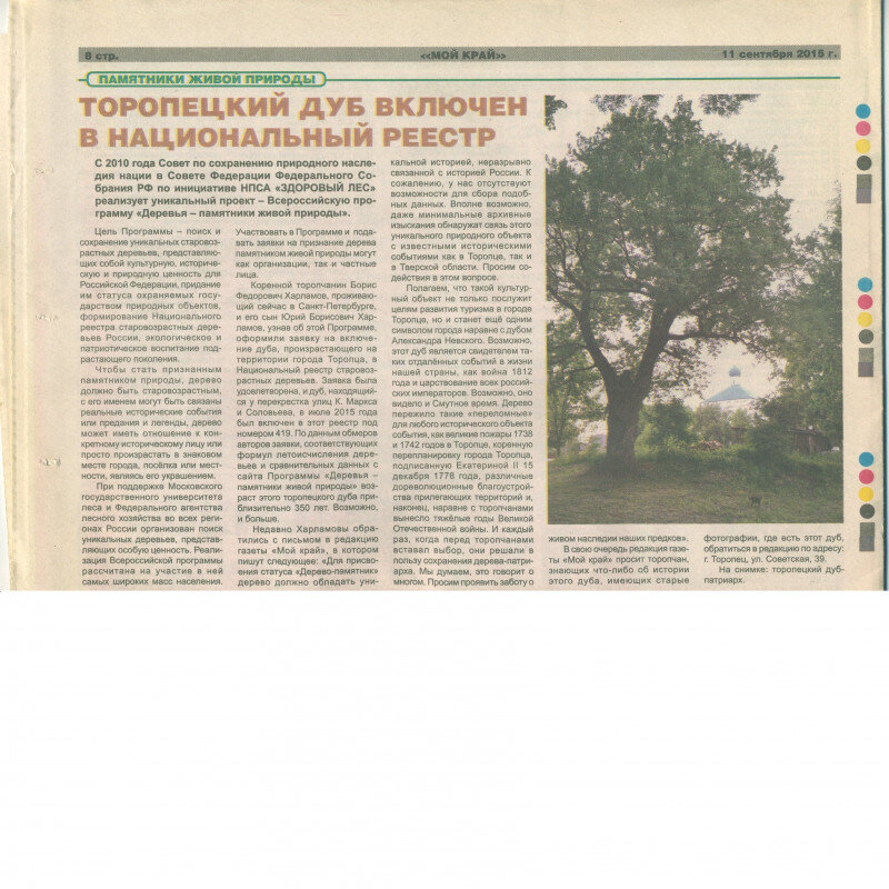 Сегодня я хочу поделиться с вами интересной информацией о родном городе моего отца - Торопце. В городе растёт замечательный древний дуб. Даже по самым скромным подсчётам, сделанным на основании его толщины, ему уже около трёхсот лет. Но подтверждённый возраст подобных деревьев был и четыреста, и пятьсот, и шестьсот лет. Дуб, как достопримечательность, как замечательный объект природы, несомненно заслуживает внимания и помощи. Сразу скажу, вы можете прочесть в интернете, что в Торопце растёт дуб князя Александра Невского. Речь сейчас не о нём. Тот дуб, как полагается, обласкан вниманием, хотя его возраст в три раза меньше, а размеры меньше раз в десять. Тот дуб - наследник того самого дуба, посаженного по преданию князем Александром Невским. От старого, того самого дуба, взяли веточку сто лет назад и посадили в Торопце. Эту историю подробно я могу написать позже. Пока пишу вкратце, чтобы вы не перепутали дубы. Наш дуб, о котором сейчас речь, хоть ещё зелен и могуч, но уже да