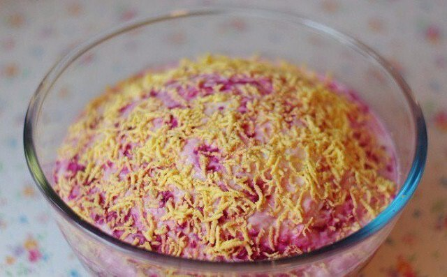 1 ½ ч. л. горчицы. Приготовление: Отварить, а затем измельчить на терке свеклу, морковь и куриные яйца.