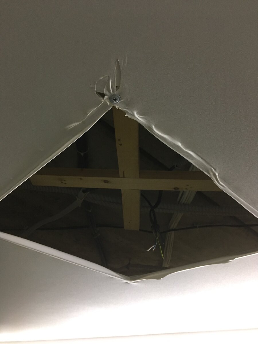 Всем привет. Поступил заказ на переделку натяжного потолка за недобросовестными монтажниками в городе Калуга. Честно говоря Я был в шоке когда увидел как установили светильники. Такого месиво из профилей,клея и чего то там ещё ,на моей памяти ещё не встречалось. Собственно из-за этого полотно потолка и порвалось.
