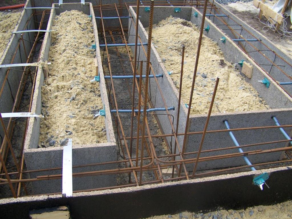 Для устройства подземной части фундаментов в открытых котлованах используют опалубку из полистирольных блоков. Они имеют повышенную прочность, хорошую водонепроницаемость, стойкость к агрессивным грунтовым водам.