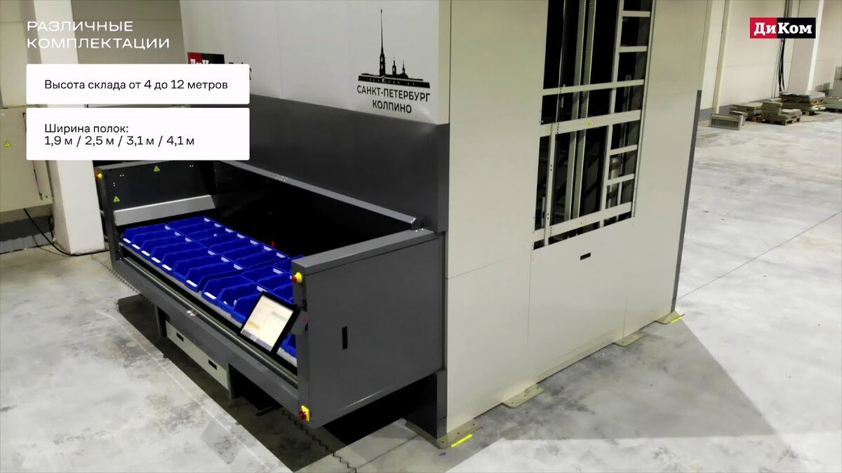 Вертикальные склады «ДиКом-Лифт» предназначены для хранения различных грузов. Склад представляет собой автоматизированную систему лифтового типа. Хранение груза осуществляется на подвижных полках, они измеряются по высоте вместе с грузом и размещаются на стеллаже с шагом 25 мм. Полки перемещаются в зону выдачи с помощью лифта с захватным механизмом.