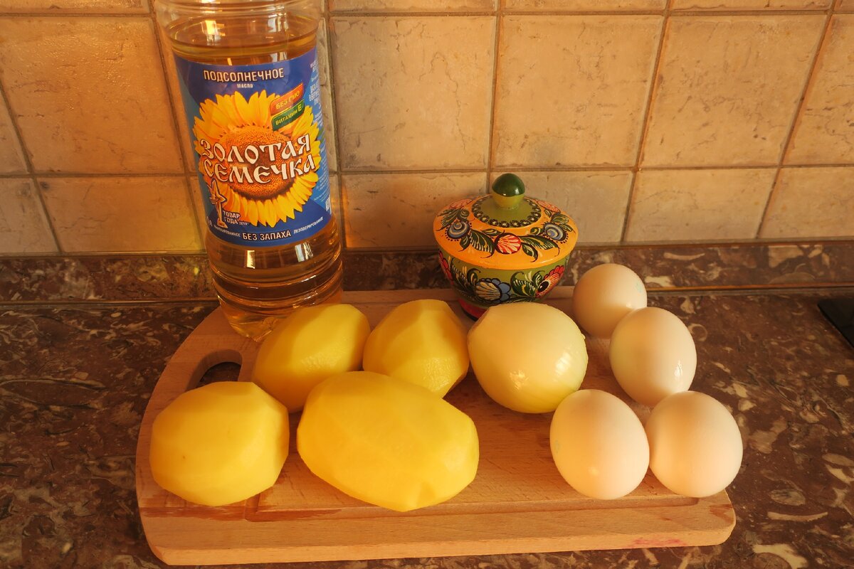 Сковороду смазываем растительным маслом, перекладываем в нее картофель с яйцами.