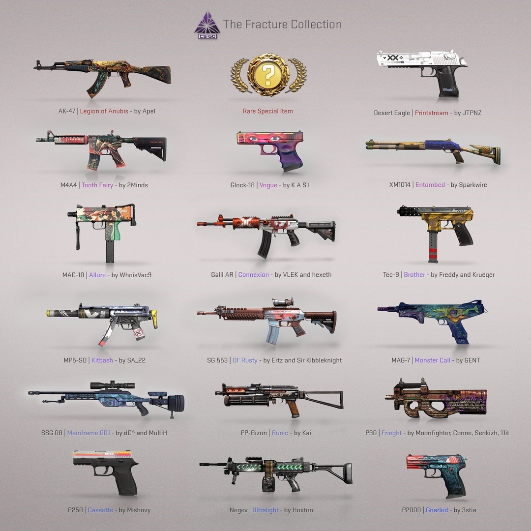 обновление CS:GO от 07.08.2020 (совпадает с временем VALVE). В игре появился новый кейс "Fracture Case" с 17 скинами внутри. Также немного изменены карты Anubis, Mutiny и Swamp. Содержание кейса