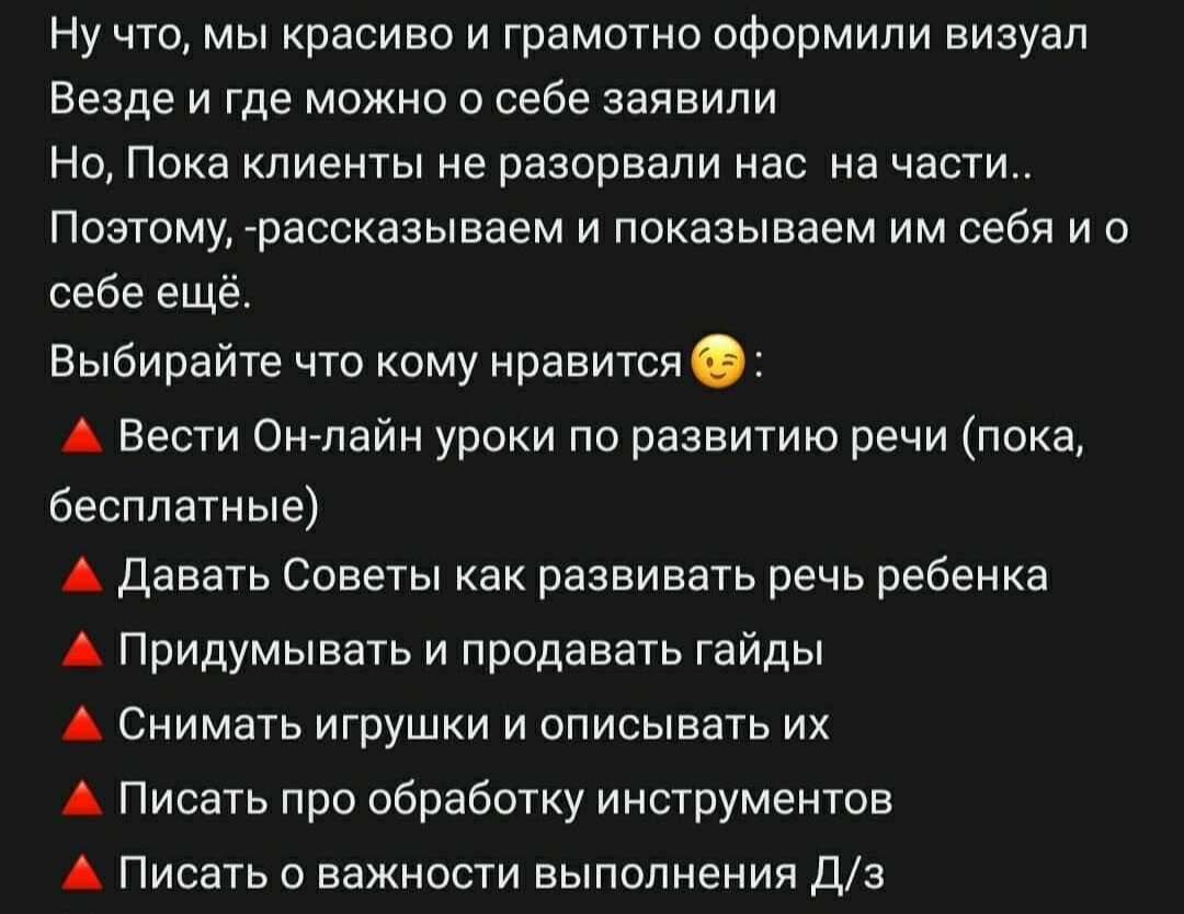 1. В первую очередь, определяемся - сколько часов в день мы можем посвятить работе. (Однозначно, по времени будет "плыть", но без этого "каши" вообще, не сварим😉) В реале: 👨👩👧👦 У семейных (с мужем, детьми и если без нянь и помощников по хозяйству) будет одна история 📜 🦸♀️А у свободных и независимых другая 📖 В нашем примере будем рассматривать "среднестатистического" логопеда у которого есть и муж и дети, но они сами с усами☝, т. е. могут о себе позаботиться. При этом, наш "логопед -пример" к семейным обязанностям относится с почтением и уважением, так что, как минимум, завтраки и ужины за столом вместе. Допустим, наш рабочий день начинается в 9 и заканчивается в 19 часов . Имеем 10 часов за минусом 2 часа (обед и кофе брейки ) Остается 8 рабочих часов. 2. 🕰Рассмотрим что они в себя включают. На этом этапе важно определить: 💰Что уже сейчас приносит Нам основной доход И 💰То к чему Мы хотим придти в перспективе 👍Если, тот вид и формат деятельности которым вы зар