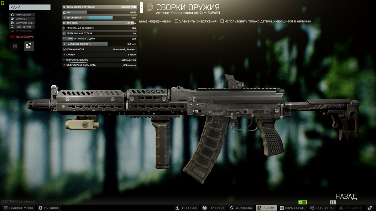Для удобства данная статья будет поделена на 3 части: 1-Автоматы серии АК-74, 2-M4А1/HK-416 и 3-СВД-С/M1A. 1: Начать хотел бы с автомата АК-74-М Данная сборка имеет следующие характеристики: эргономика-67.5, вертикальная отдача-50, горизонтальная отдача-139, начальная скорость-910 м/c. В данную сборку входят: Примерная стоимость данной сборки равна 273.289 рублей+25.000 рублей за тактическую рукоятку рк-2, продающуюся у торговца лыжник на 4 уровне лояльности. Затем у нас идёт автомата АК-74-Н Данная сборка имеет следующие характеристики: эргономика-63.5, вертикальная отдача-47, горизонтальная отдача-124, начальная скорость-910 м/c. В данную сборку входят: Примерная стоимость данной сборки равна 309.961 рубль+25.000 рублей за тактическую рукоятку рк-2, продающуюся у торговца лыжник на 4 уровне лояльности. В заключении хотел бы сказать, что лично я бы выбрал АК-74-М потому как он хоть и имеет более скромные характеристики отдачи, но они не стоят переплаты в 36.000 рублей и к