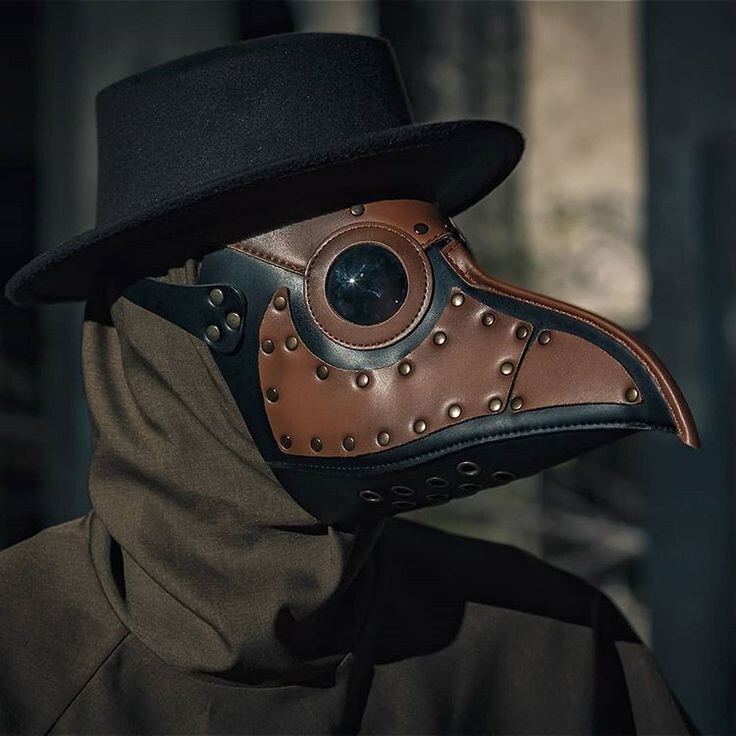 Этот причудливый, максимально закрытый с головы до ног костюм шился из кожи, а также промасленной или вощеной холщовой ткани, в прорези для глаз вставлялись большие стеклянные линзы, а длинный «клюв» с парой небольших отверстий для дыхания выполнял роль противогаза — в него клали ароматические специи (камфару, мяту, гвоздику и мирру), сухие цветы или тряпку, промоченную уксусом. Если запахи не перекрывали вонь, которую источали больные чумой, то врачи поджигали содержимое маски. Таким образом, дымок не только глушил вредные миазмы для врача, но и разносил «дезинфицирующие» ароматы по округе. Кроме того врач в обязательном порядке во время общения с больными обязан был жевать чеснок и носил в ушах и носу маленькие куски ткани, пропитанные ладаном. В руках чумные врачеватели носили палочки, с помощью которых как дирижеры не только раздавали указания, но и производили с больными различные манипуляции. Например, палочками меряли пациентам пульс, снимали с них одежду, а также отталкивали по
