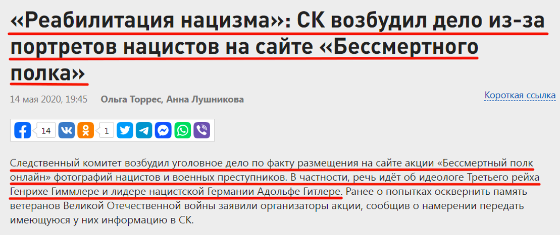 Во время организации онлайн-шествия «Бессмертного полка» была предпринята циничная попытка осквернить память советских воинов и дискредитировать проведение акции через размещение на сайте фотографий лидеров нацистской Германии. В ходе последовавшего после обращения организаторов в следственные органы разбирательства, СК РФ завел ряд уголовных дел.