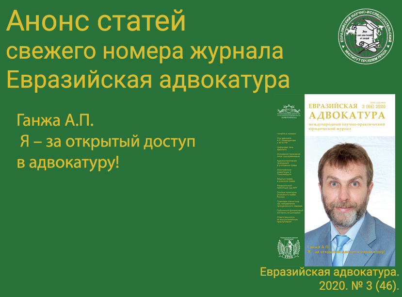 Анонс публикаций журнала Евразийская адвокатура №3 (46) за 2020 год. Ознакомиться со статьёй можно по адресу http://www.eurasian-advocacy.ru/