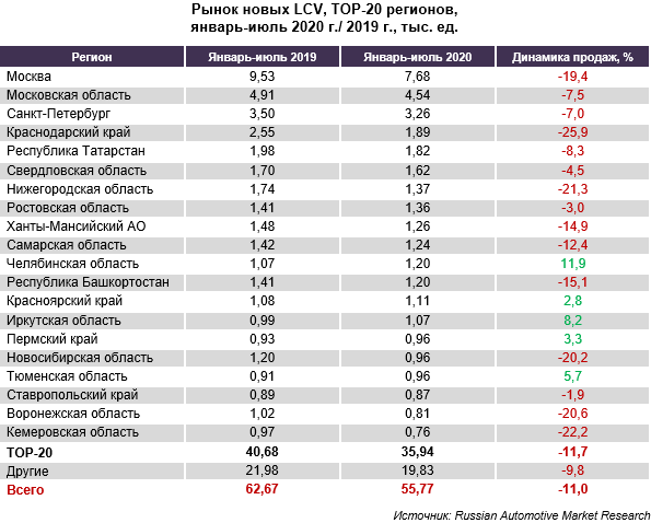 По итогам января-июля 2020 г. продажи новых LCV[1] составили 55,8 тыс. ед. – на 11% меньше, чем в аналогичном периоде 2019 г. Рынок новых LCV в июле 2020 г. сократился на 0,7% относительно июля 2019 г. до 8,4 тыс. ед. Рейтинг регионов по продаже новых LCV в июле 2020 г. возглавили Москва, Московская область и Санкт-Петербург. Несмотря на общее снижение продаж новых LCV в июле 2020 г., ряд региональных рынков из ТОР-20 продемонстрировали заметную положительную динамику: в Ханты-Мансийском автономном округе, Свердловской и Самарской областях рост продаж превысил 25%. [1] Полной массой до 6 т включительно; включая пикапы https://www.napinfo.ru/press-releases/prodazhi-legkovykh-avtomobiley-i-lcv-v-regionakh-rossii-2
