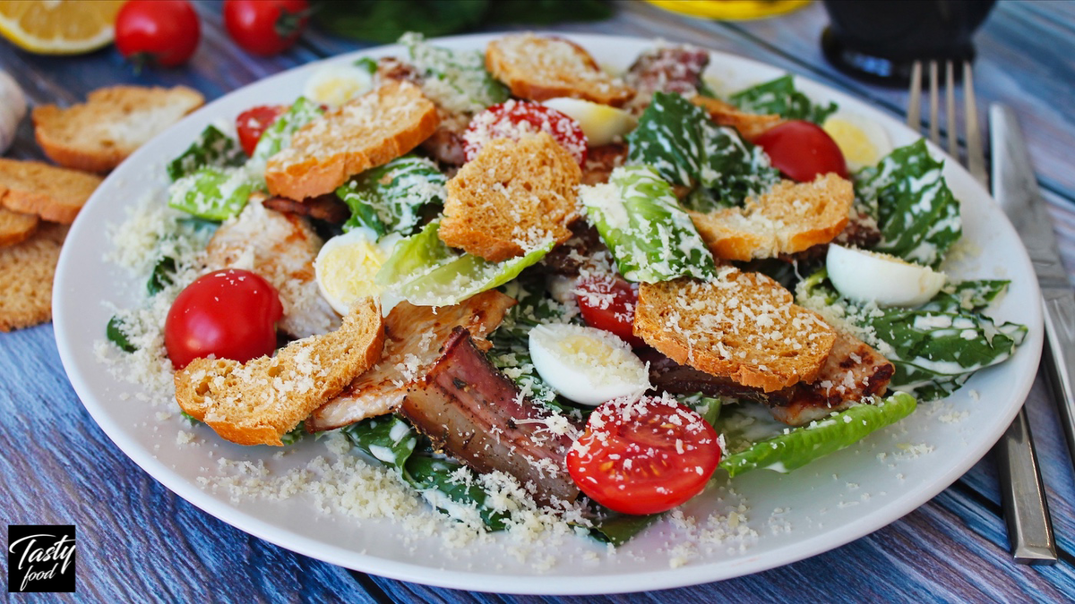 РЕЦЕПТ 🗒на 4 порции: 📍бекон 70 г 📍филе индейки или куриное 150 г 📍салат Ромен 350-400 г 📍яйца перепелиные 8 шт 📍помидоры черри 200 г 📍багет 10-12 ломтиков 📍сыр пармезан 150 г