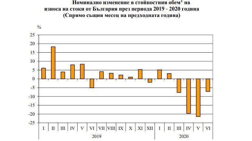 С января по июнь 2020 года Болгария экспортировала товаров на 26 059 млн. левов, что на 8% меньше, чем за этот же период 2019 года, показывают данные Национального института статистики... С января по июнь экспорт Болгарии снизился на 8%