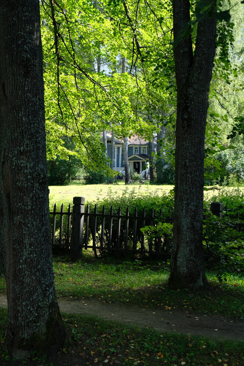 С дороги дом практически не виден - он утопает в зелени окружающих его деревьев. Также перед самым фасадом здания растут ели, высаженные по кругу. Краем уха я услышала от экскурсовода, что такая посадка имеет функциональный характер - деревья защищают дом от холодных северных ветров.