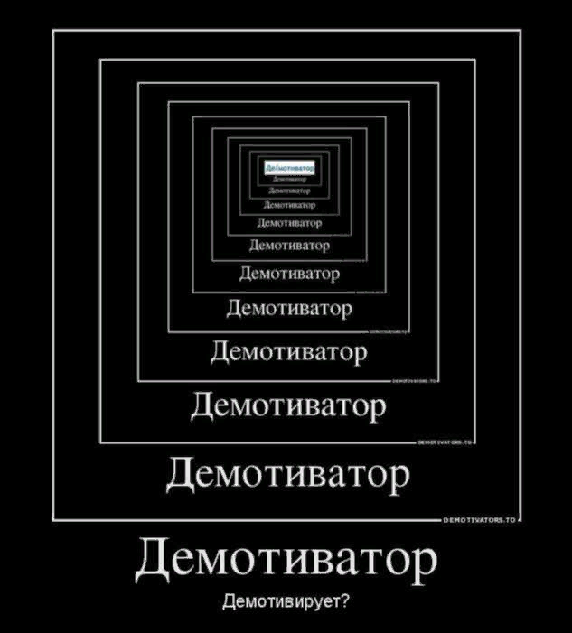 Всем привет, в сегоднейшей статье мы будем выяснять, откуда появились демотиваторы и демотивируют ли они. Демотива́тор (демотивационный постер) — разновидность настенного плаката. Демотиватор пародирует мотиваторы (плакаты, предназначенные для создания рабочего настроения), используя схожие с мотиваторами изображения, но с подписями, формально направленными на создание атмосферы обречённости и бессмысленности человеческих усилий. Формат демотиватора включает базовое изображение в рамке, обрамлённое относительно широкими, чаще всего чёрными, полями и снабжённое по нижнему более широкому полю лозунгом, выполненным крупным белым или жёлтым шрифтом. Помимо слогана многие демотивационные постеры содержат текст-пояснение, выполненное мелким шрифтом, так или иначе оттеняющее смысловое наполнение изображения и/или слогана. Вскоре после появления интернета демотиваторы стали интернет-мемом. Ага, мы узнали что такое демотиваторы, а теперь давайте разберёмся в их истории: Демотиваторы появились