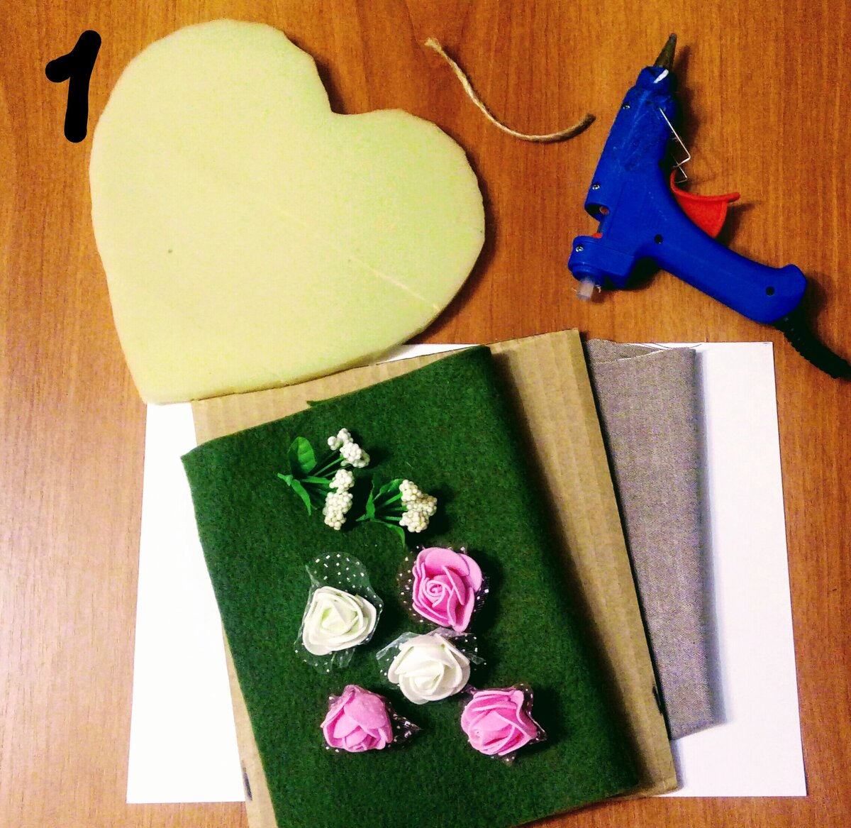 1. Для работы нам понадобятся: картон плотный и тонкий, тонкий пароллон (или пласт синтепона), ткань однотонная, цветы из фоамирана, искусственные веточки-соцветия, фетр зеленый (или готовые искусственные листики), бусины "под жемчуг", кусочек веревочки для петельки, клеевой пистолет.