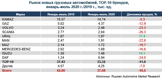 В январе-июле 2020 г. на российском рынке продано 37,6 тыс. ед. новых грузовиков, что на 10,5% меньше, чем в АППГ. В июле 2020 г. продажи грузовой техники упали на 4% и составили 6,3 тыс. ед. Продажи новых грузовиков лидера рынка - бренда KAMAZ – в июле текущего года увеличились на 14,4% и составили 2,62 тыс. ед. На втором месте расположился GAZ, продажи которого сократились на 7,0% до 0,77 тыс. ед. Также в ТОР-3 вошел бренд SCANIA, который реализовал 0,38 тыс. ед. грузовой техники (-6,1%). Помимо бренда KAMAZ, положительная динамика продаж среди первой десятки отмечена у марок ISUZU (+22,3%) и URAL (+5,3%)... https://www.napinfo.ru/press-releases/itogi-iyulya-rynok-kommercheskoy-tekhniki-v-minuse