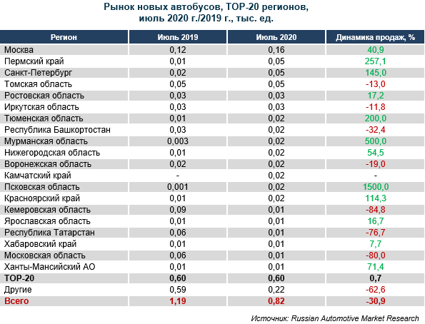 В январе-июле 2020 г. на российском рынке продано 7,0 тыс. ед. новой автобусной техники, что на 4% меньше результата АППГ. Рынок новых автобусов в июле 2020 г. сократился на 31% относительно июля прошлого года. Всего в июле 2020 г. на российском рынке реализовано 0,8 тыс. ед. новых автобусов. В июле 2020 г. рейтинг регионов по продаже новых автобусов возглавили Москва, Пермский край и Санкт-Петербург. Спрос на новые автобусы в июле вырос в двенадцати регионах из первой двадцатки. ... https://www.napinfo.ru/press-releases/itogi-iyulya-rynok-kommercheskoy-tekhniki-v-minuse