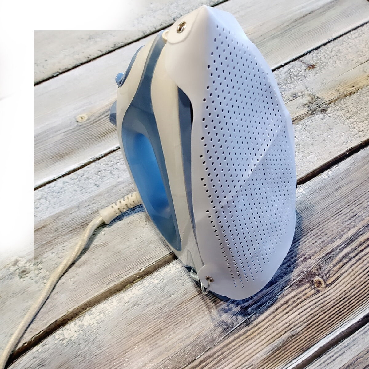 Носик укреплен металлическими клепками. По противоположной стороне на металлических кольцах прикреплена тугая спираль, обеспечивающая плотный захват насадкой поверхности утюга. Тефлон в меру плотный, толщиной примерно 1-1,5мм. Сама насадка перфорирована мелкими отверстиями, позволяющими осуществлять процесс глажки в режиме отпаривания.