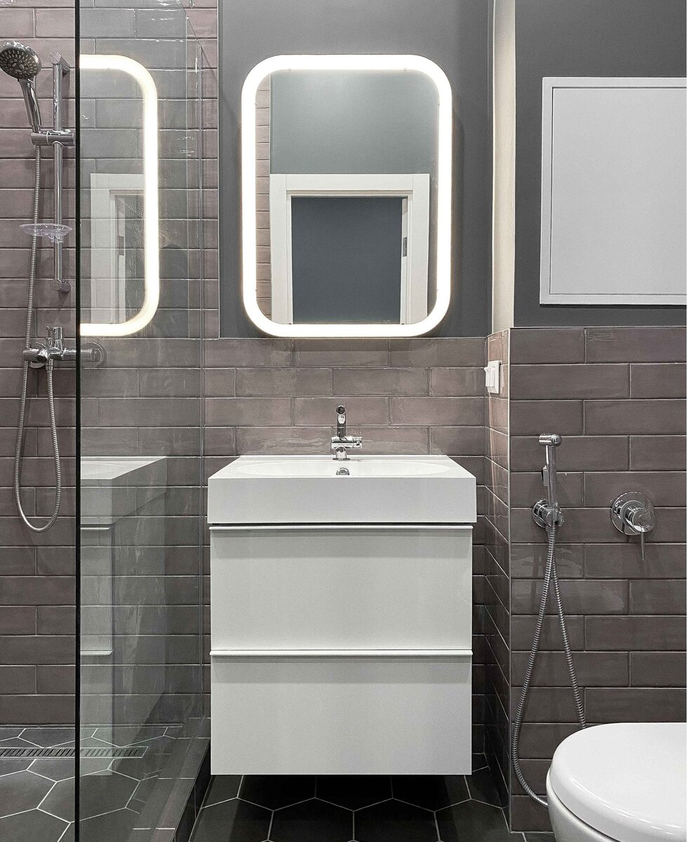 Вот такая ванная комната в пыльных оттенках с этой же квартиры у нас получилось