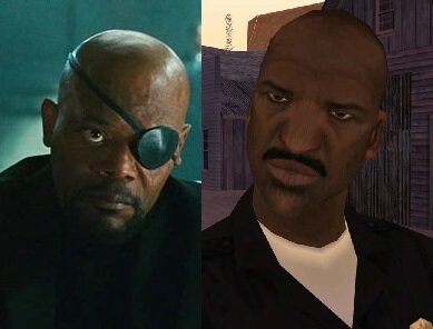 Фрэнк Тенпенни и Ник Фьюри (Мстители) Продажного копа Фрэнка Тенпенни в GTA: SA озвучил Samuel L. Jackson. Один из самых профессиональных актеров Голливуда (по мнению многих критиков). Снялся в более 100 фильмах самых разных жанров, среди них можно выделить - "Мстители", "Криминальное чтиво", "Игры патриотов", "Парк юрского периода" и т.д. Ник Фьюри - супергерой, директор Щ.И.Т., которого играет Сэмюэл Л. Джексон в фильмах от Марвел. Эдди Пуласки и Клайв (Час Пик) Крис Пенн - американский актёр, снявшийся в более 70-ти фильмах. Одна из известных ролей - роль Клайва Кобба (второстепенная роль, продавец взрывчатки) в фильме "Час Пик". Собственно именно Крис Пенн озвучил напарника Фрэнка - Эдди Пуласки. Майк Торено и Джеймс Вудс (Симпсоны) Майка Торено озвучил Джеймс Вудс, как и одноимённого персонажа в мультсериале "Симсоны". Джеймс Вудс - американский актёр. Самые выдающиеся его работы - "Однажды в Америке", "Полицейский", "Чаплин". В "Симсонах" Джеймс Вудс - это тоже актёр, который уст