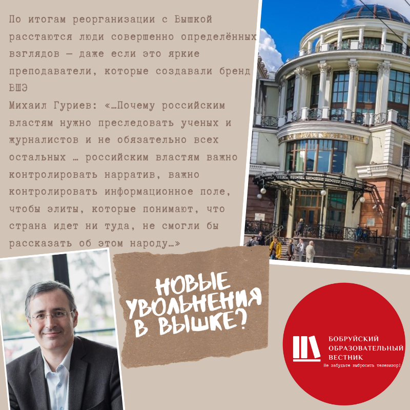 По итогам реорганизации с Вышкой расстаются люди совершенно определённых взглядов — даже если это яркие преподаватели, которые создавали бренд ВШЭ Михаил Гуриев: «…Почему российским властям нужно преследовать ученых и журналистов и не обязательно всех остальных … российским властям важно контролировать нарратив, важно контролировать информационное поле, чтобы элиты, которые понимают, что страна идет ни туда, не смогли бы рассказать об этом народу…» Михаил Гуриев, интервью Эхо Москвы: https://echo.msk.ru/programs/statuss/2690379-echo/