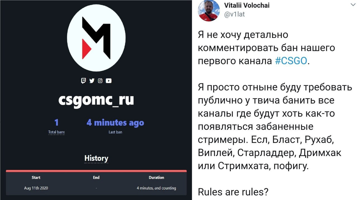 Как вам может быть известно у компании Maincast, которая освещает киберспортивные события был забанен первый канал по игре CSGO. Maincast назвал причину бана на Twitch — на трансляции появились заблокированные ранее s1mple, Zeus и Kyivstoner. Но один из владельцев Maincast Виталий "v1lat" Волочай считает, что такое наказание несправедливо, ведь в таком случае за появление забаненных профессиональных игроков на крупных турнирах должны наказывать таким же образом таких гигантов как ЕСЛ и другие каналы освещающие киберспортивные дисциплины. Источник: Twitch_News Как вы считаете права ли в данной ситуации администрация Twitch?