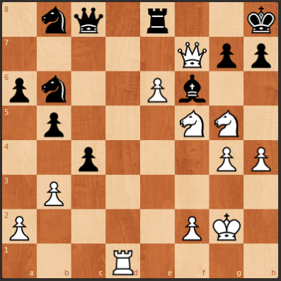 Предлагаю Вашему вниманию окончание партии Таль- Портиш, 1976 год. Таль уже пожертвовал слона, но получил грозную пешку на е6. Два белых коня белых так же в атаке. Белые начинают и выигрывают.