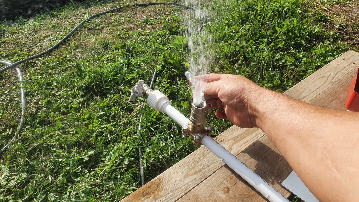 С трубы идет вода, небольшой струйкой, которая ни как не перекрывается на вводе и
