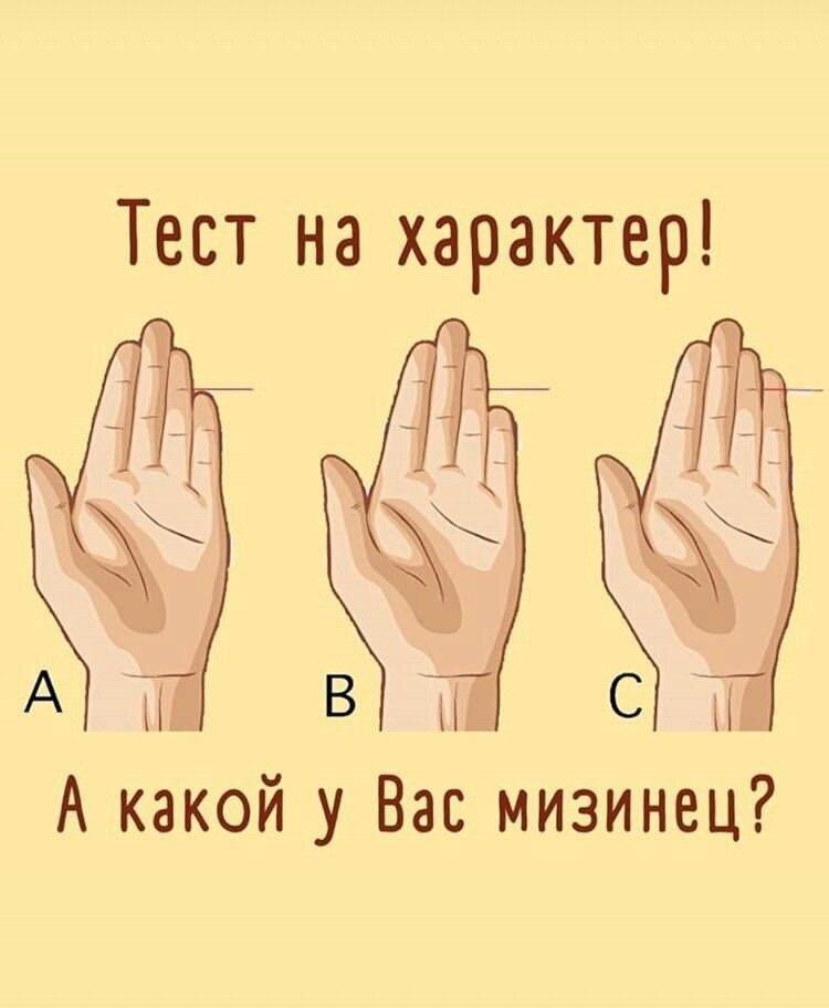 Длина мизинца относительно безымянного пальца может многое о Вас рассказать. Основные цели, которые ставит перед собой данный тест - это определить ваши черты характера, отношение к Вам других людей, а также определить склонность к болезням желудка и селезёнки. Суть теста: расположите рядом мизинец и безымянный палец. Выровняйте их относительно ладони, чтобы пальцы находились перпендикулярно ладони и не заваливались ни влево, ни вправо. Иначе результаты будут некорректными. Для большего удобства лучше поставить локти на стол, а не держать руки на весу. Теперь посмотрите внимательно на пальцы. Найдите у безымянного пальца сгиб между первой и второй фалангой. И определите выше, ниже или вровень с ним находится кончик мизинца. Соотнесите эти данные с картинкой выше и выберите соответствующую цифру. Для верности посмотрите уровень мизинца относительно безыменного на обеих руках. Теоретически они должны быть одинаковы. Если у вас буква А Ваша личность: Вы предоставлены сами себе. Вы предп
