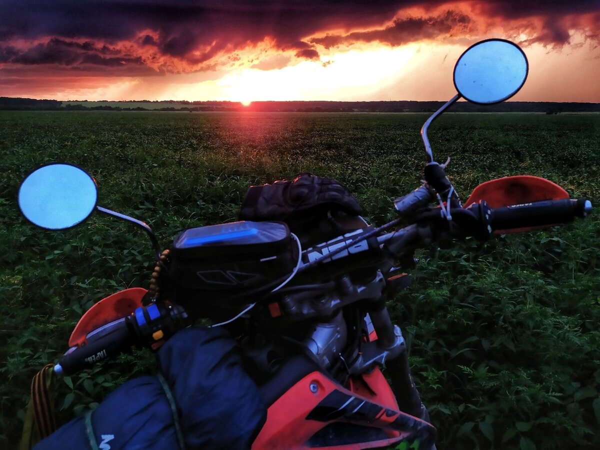 И только я успел поставить мотоцикл на подножку и слезть с него, как началось это невероятное светопредставление. Весь горизонт был охвачен насыщенным алым заревом, не как обычно, бордовым, а именно алым, как кровь в венах, а над ним сгустились страшной красоты рваные грозовые тучи, так же озарённые этим алым закатом. Признаться честно, я никогда ранее не видел ничего подобного, это было од