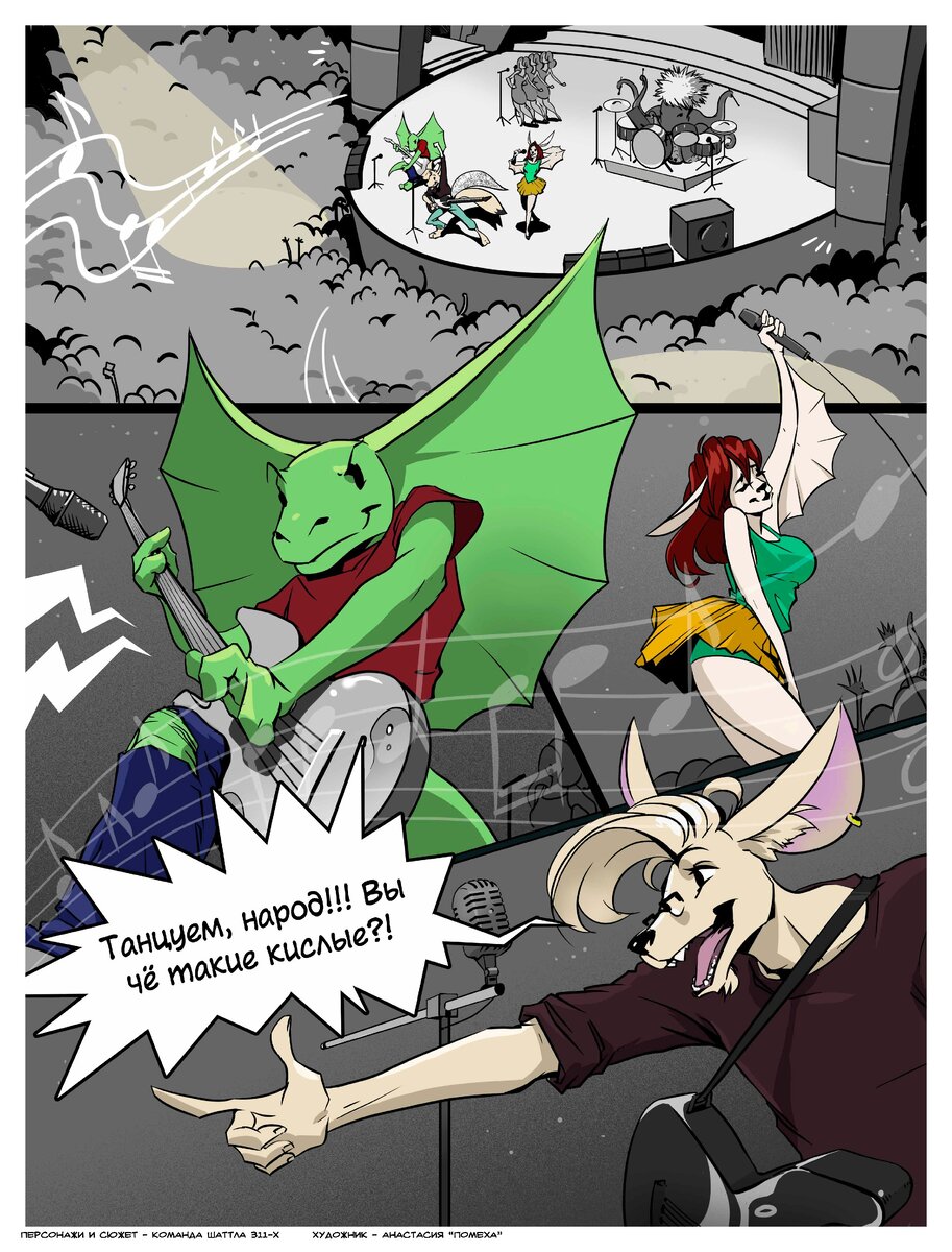 Этот комикс, кстати, фактически трустори! "Заводить толпу" надо уметь, иначе можно неудачно напороться на нытиков среди аудитории, и всё концертное время придётся потратить на долгую групповую терапию) (Кто угадает, в какую игру на заднем плане рубятся Куззя и Буря Бурикко?;)