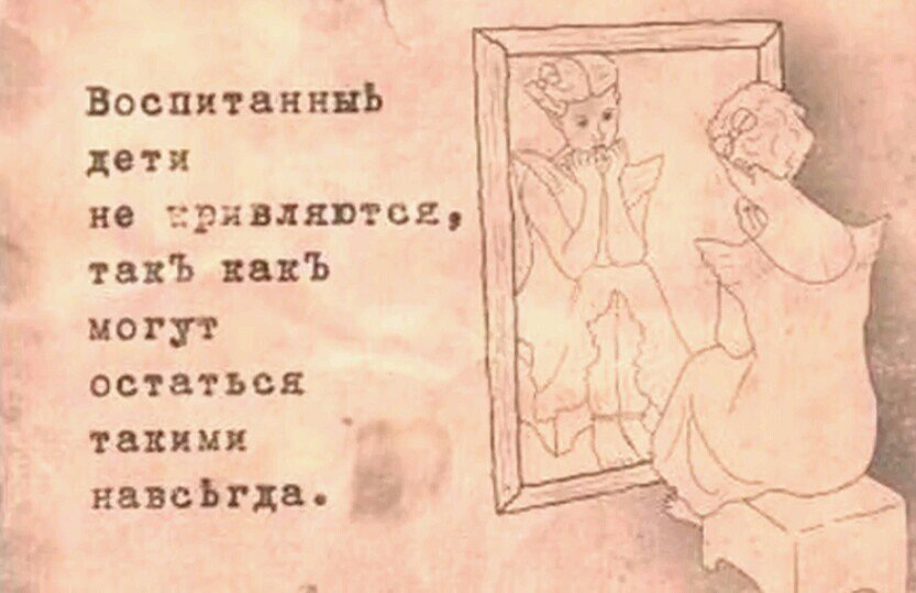 В пустом доме они обнаружили следы предыдущих посетителей, недавние надписи на стенах и антикварную, XIX века, открытку из серии о хороших манерах. На открытке была изображена девочка, стоявшая на коленях на пуфике у трюмо и показывающая своему отражению язык. Надпись гласила: «Воспитанные дети не искажают лиц, ибо рискуют остаться такими навсегда».
