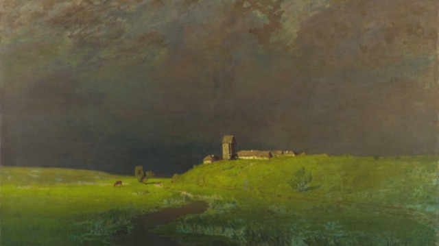 Зритель видит яркий, сочный пейзаж, обновлённый сильным и животворящим дождём. Судя по тёмным и несколько зловещим облакам, гроза была нешуточной. Вода смыла с травы все признаки долгого зноя и засухи.