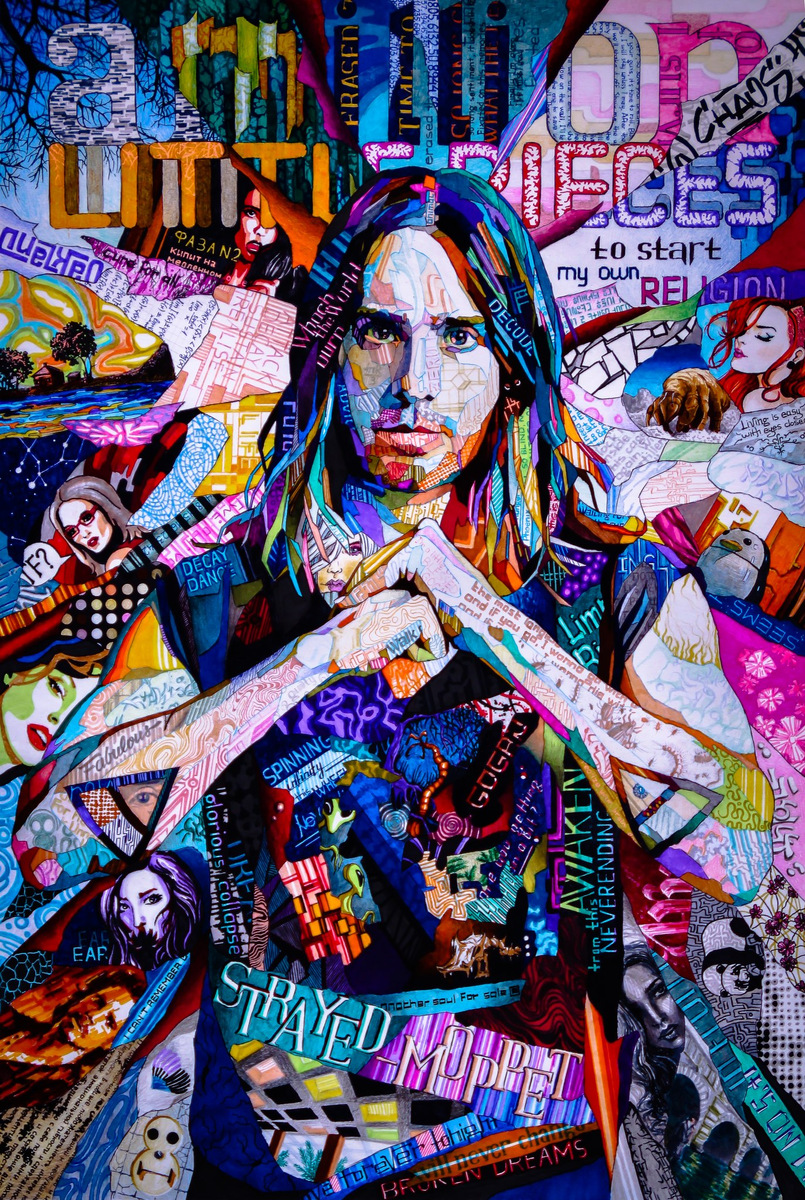 История вполне обыденная. Пришёл на выставку и увидел там картины, склеенные из журнальных обрезков. Там были изображены предметы, а я вернулся домой и нарисовал портрет. В том же стиле, но карандашами, имитируя обрезки. К моему удивлению, получилось круто! В этом есть своя философия. Вырванные из контекста кусочки – это метафора современного мира. Мы видим информацию в интернете, в магазинах, в новостях, но нас не интересует вся картина – мы выхватываем фрагменты и перелистываем страницу. Большую часть нашего повседневного существования составляют именно эти фрагменты.