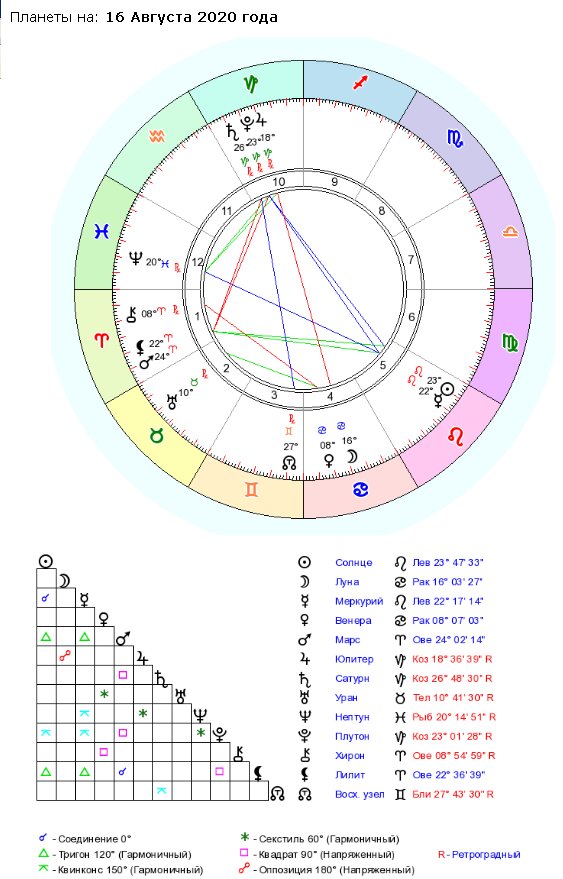 Держитесь подальше от воды! Есть риск утонуть. Этот день насыщен противоречивыми энергетиками. Много положительных, но снова начинается рост негативных. Знаки воды и земли особенно подвержены негативу. В этот день у нас: оппозиция, два соединения, четыре тригона, четыре квинконса, три секстиля, четыре квадрата. К ретроградным планетам добавляется Уран. Оппозиция Луны и Юпитера предупреждает об опасности воды. Риск утонуть становится очень сильным. День неблагоприятен для: путешествий, общения с иностранцами, перееданий. Люди склонны к крайностям в выражении эмоций. Что-то типа «Гулять – так гулять!» Соединение Солнца и Меркурия очень благоприятно повлияет на ум, новые идеи, дружбу и работу. Правда у некоторых Скорпионов оно попадёт в десятый дом и это приведёт к трудностям с работой. Соединение Марса и Лилит склоняет людей к мятежности, дерзости, безрассудной храбрости и может указывать на стремление к насилию. Опасный, агрессивный аспект. Возможно, именно его влияние объясняет все