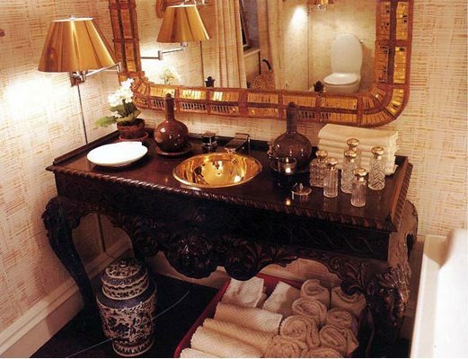 - Умывальный столик. Также может быть выполнен в старинном стиле. В отличие от других конструкций, к нему предъявляются повышенные требования. Не допускается наличие острых углов и шероховатых кромок, так как они могут стать причиной получения травмы. Умывальные столики между собой различаются по конструкции – одни практически полностью скрывают водную струю внутри чащи, другие же выставляют водный поток на всеобщее обозрение.