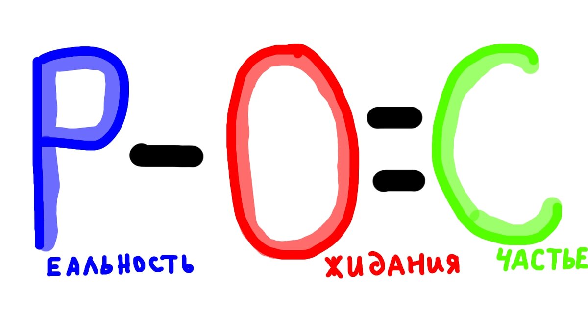 РЕАЛЬНОСТЬ – ОЖИДАНИЯ = СЧАСТЬЕ То есть, реальность минус ожидания дает отличное счастливое настроение. Да, формула простая, но главное научиться ей правильно пользоваться. Сложность заключается в отсутствии понимания механизма взаимодействия переменных "Реальность" и "Ожидания". Замете, в формуле именно из "Реальности", то есть из фактов жизни, вычитаются "Ожидания" (ваши цели, намерения, фантазии и стремления) Именно при "Ожиданиях" больших чем "Реальность" формула дает минус, то есть, состояние несчастья. Примеры По сути у нас есть всего 3 варианта повысить уровень СЧАСТЬЯ Улучшить РЕАЛЬНОСТЬ, а ОЖИДАНИЯ оставить без изменений Уменьшить ОЖИДАНИЯ, а РЕАЛЬНОСТЬ оставить без изменений Улучшить РЕАЛЬНОСТЬ и уменьшить ОЖИДАНИЯ Ваши ожидания являются краеугольным камнем вашего счастья. (чрезмерные фантазии в отрыве от реальности)