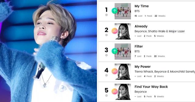 “My Time " подскочил с #15 до #1 между прошлой неделей и этой неделей, благодаря преданным поклонникам, благодаря которым продажи сингла подскочили на невероятные 733% с 3000 новыми продажами! Арми сделали это в качестве подарка на день рождения для Чонгкука, которому 1 сентября исполнится 23 года. Альбом, из которого взята эта песня , Map of the Soul: 7, сделал свою собственную серию достижений на Billboard, дебютировав на #1 в чарте Billboard 200, а также проведя в общей сложности 19 недель на #1 в мировом чарте альбомов.