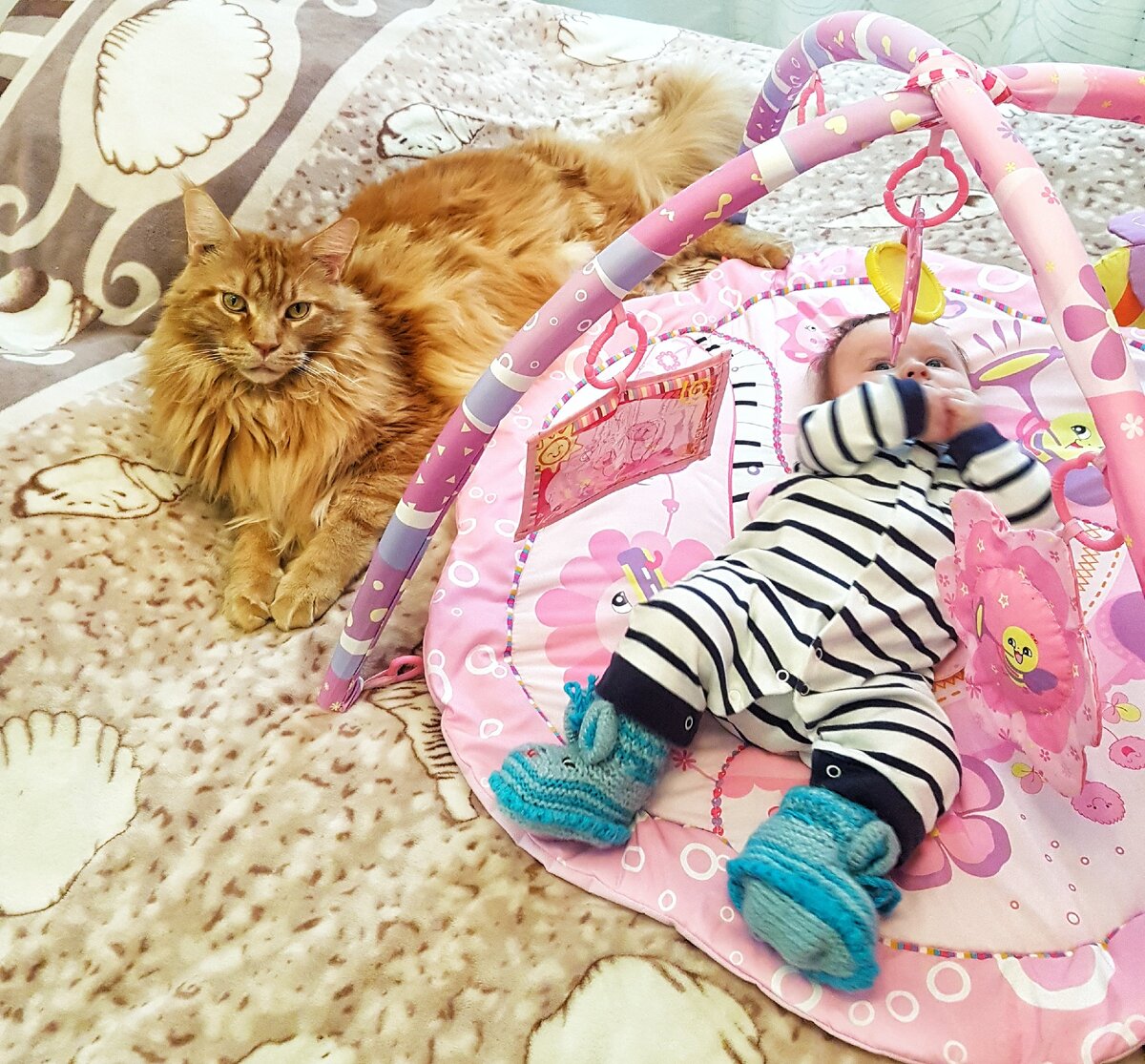 В нашей семье кот появился раньше чем дети, еще когда я была беременна. Конечно же, одним из поводов для переживаний был вопрос аллергии у детей. А что если она будет? Как реагировать? Что делать? Выгонять кота? С этими мыслями мы жили до рождения доченьки и как же мы были счастливы, что аллергии у нее, как и у нас, на кошачью шерсть не было. Когда мы собрали детскую кроватку - кот решил, что она для него. Мы пробовали выгонять его, ругали, выгоняли из комнаты - всё без толку! Не помог даже балдахин. Его кот просто отодвигал лапой и запрыгивал внутрь кроватки. В конечном итоге мы смирились и сняли балдахин, т.к. Цезарь его порвал. Он постоянно спал в детской кроватке. Только отвернешься - и он уже там! И неважно, спит ли там ребенок. Цезарь всегда спал "в ногах" дочки и ей не мешал. Так было до тех пор, пока Ева (дочка) не научилась ползать. Цезарь сразу смекнул, что на его хвост началась охота и изящно запрыгивал в места, где повыше. Это мог быть подоконник или его специальный ко