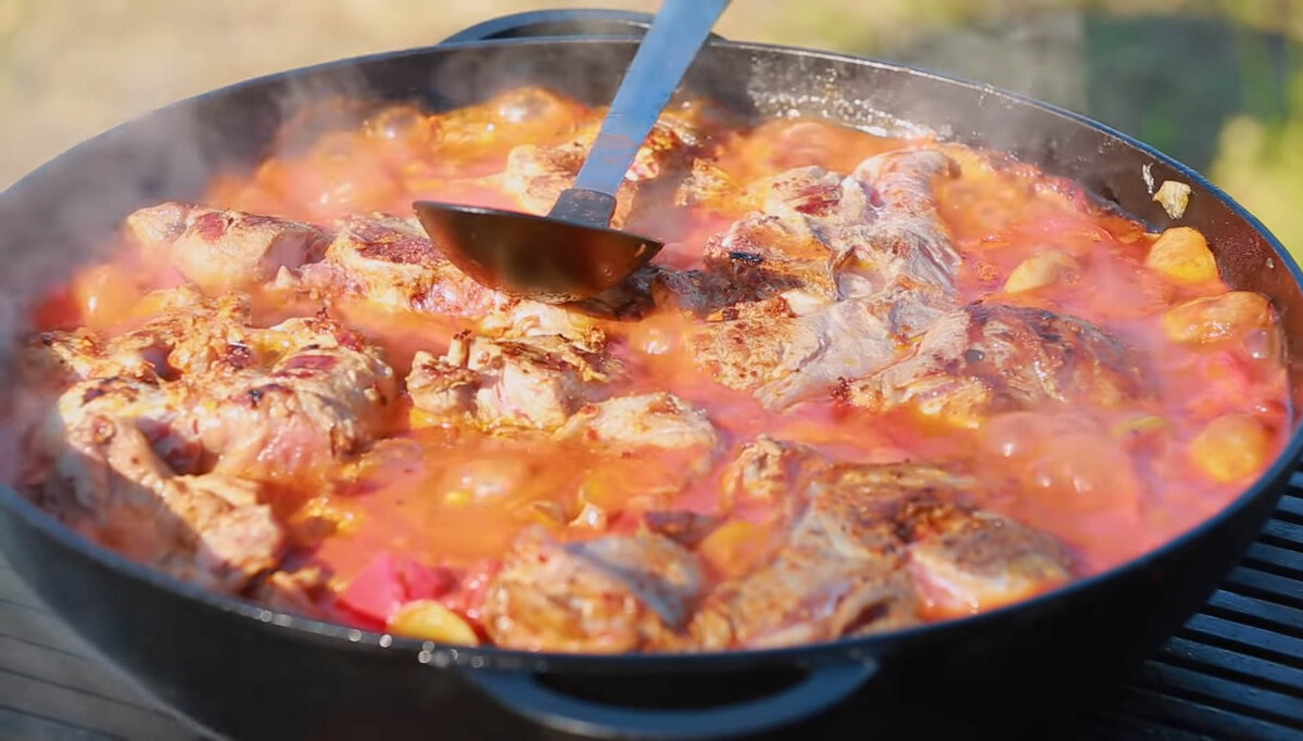 Мясо заранее посолили, замариновали на свой вкус специями, которые вам подходят. И бросили его на решетку, слегка обжарили. Как популярно говорят, что бы его запечатать. За одно оно изароматизируется дымком и даст его потом блюду, и меньше полезных веществ будет из него вытекать. Магний, кальций, цинк... А и то, что вытечет, все равно попадет в соус. Особенно это касается говядины. Дети у меня любят больше мясо, чем овощи и соус.