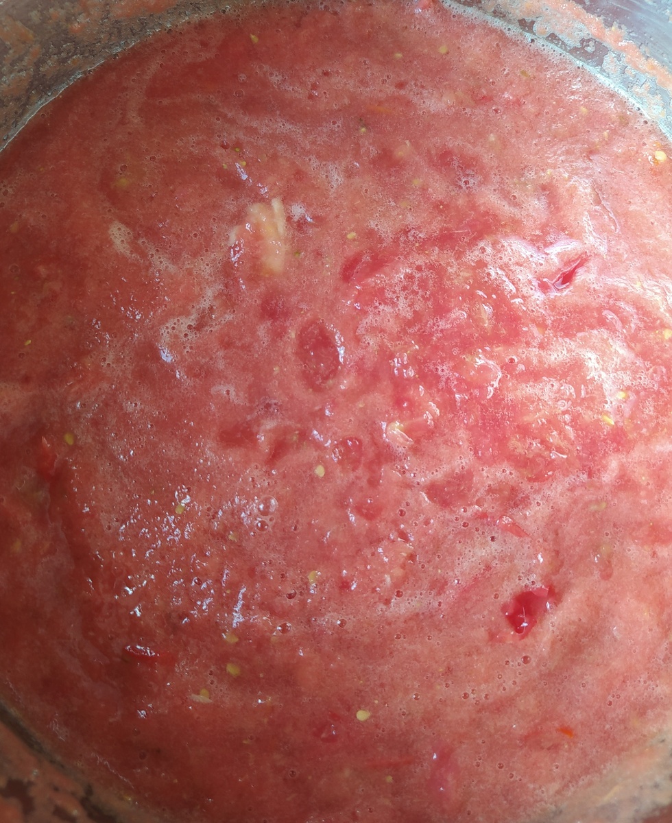 Помидоры маринованные мы не очень любим, но в томатном соусе уходят как семечки, делаю в маленьких баночках, чтобы открыл и съел. Соус можно добавлять в зажарку, просто с чем нибудь поесть. Ингредиенты Помидоры большие Помидоры маленькие Специи - укроп, петрушка, семена кинзы, гвоздика по вкусу Чеснок 3 зуб Соль 2 ст.л Сахар 6 ст.л Уксус 1 ч.л Приготовление 1 Пробить на комбайне большие помидоры. 2 Поставить варить на плиту, добавить зонтики укропа, петрушку, пару шт гвоздики, семена кориандра. (можно добавить перец горошком, душистый, острый) Варить 10 минут после закипания. Перемешать. Выключить. 3 Проколоть маленькие помидоры зубочисткой, уложить в чистые банки и залить кипятком. Оставить до остывания воды. У меня 4 банки по 750 гр. 4 Томатный сок процедить через сито/дуршлаг от кожицы и семечек, жмых хорошо отжать. (У меня получилось 2 л сока) Поставить однородную массу на плиту. 4 Добавить соль, сахар. Я добавляю сначала по 1 ст.л хорошо перемешиваю и пробую, если чего то не хв