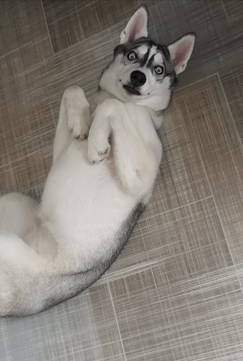 По одной из легенд, предок, от которого и произошли сибирские хаски, очень любил Север. Лед, снег и бесконечное синее небо, отраженное в холодных водах северных морей. Он так долго и с такой любовью смотрел на суровую красоту северной природы, что лед и небесная синь проникли в его сердце, окрасив радужки глаз голубым и льдисто-серым. Это со стороны романтической версии, а если же говорить о сухих научных фактах, то столь необычный цвет глаз у хаски — простая мутация. Американские специалисты узнали, что у всех голубоглазых псов есть две одинаковые мутации в генах, причем ненормальности в устройстве последнего гена имелись практически у всех представителей породы. Выявление этого гена, по мнению исследователей, поможет проследить историю развития и приручения хаски, а владельцам собак — знать, будут ли щенки от подобранных производителей голубоглазыми или кареглазыми. У Нашей Дарки глаза светло светло голубые. Так и не поймешь, белые или синие. Иногда у неё один оттенок, иногда друг
