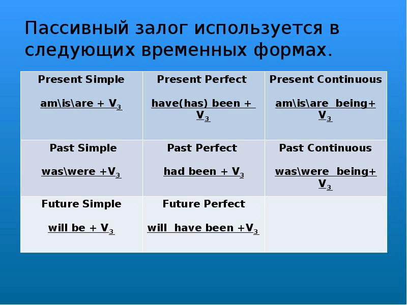 Глаголы английского языка обладают такой грамматической категорией, как залог (voice). Он показывает, само ли подлежащее производит действие или оно является объектом действия. Именно с этой целью все глаголы английского языка употребляются либо в действительном или активном залоге (active voice), либо в страдательном или пассивном залоге (passive voice). Если подлежащее само производит действие, то мы используем глагол в действительном залоге. Например: They often join me at the meetings. – Они часто ходят со мной на собрания. Our relatives presented us with a bouquet of flowers. – Наши родственники подарили нам букет цветов. Пассивный залог в английском языке Пассивный (или страдательный) залог в английском языке употребляется в тех случаях, когда факт совершения действия гораздо важнее, чем его исполнитель. The towels were not used yesterday. – Полотенцами вчера не пользовались = Полотенца не были использованы вчера. В данном предложении подлежащее обозначает предмет (полотенца), к