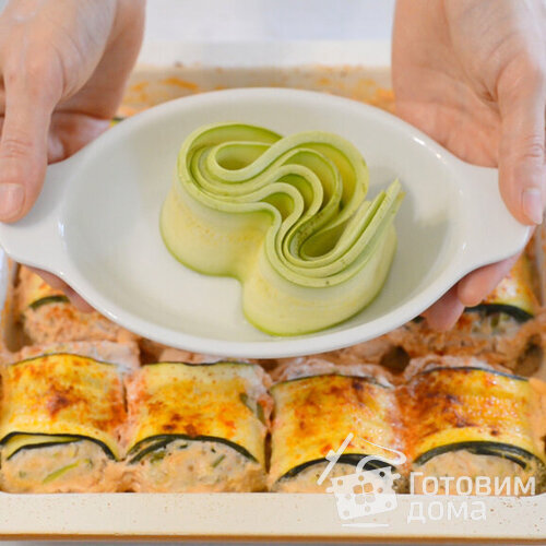 Сочный фарш, завернутый в ленты из кабачков, и вся эта красота запекалась под нежным сметанным соусом.