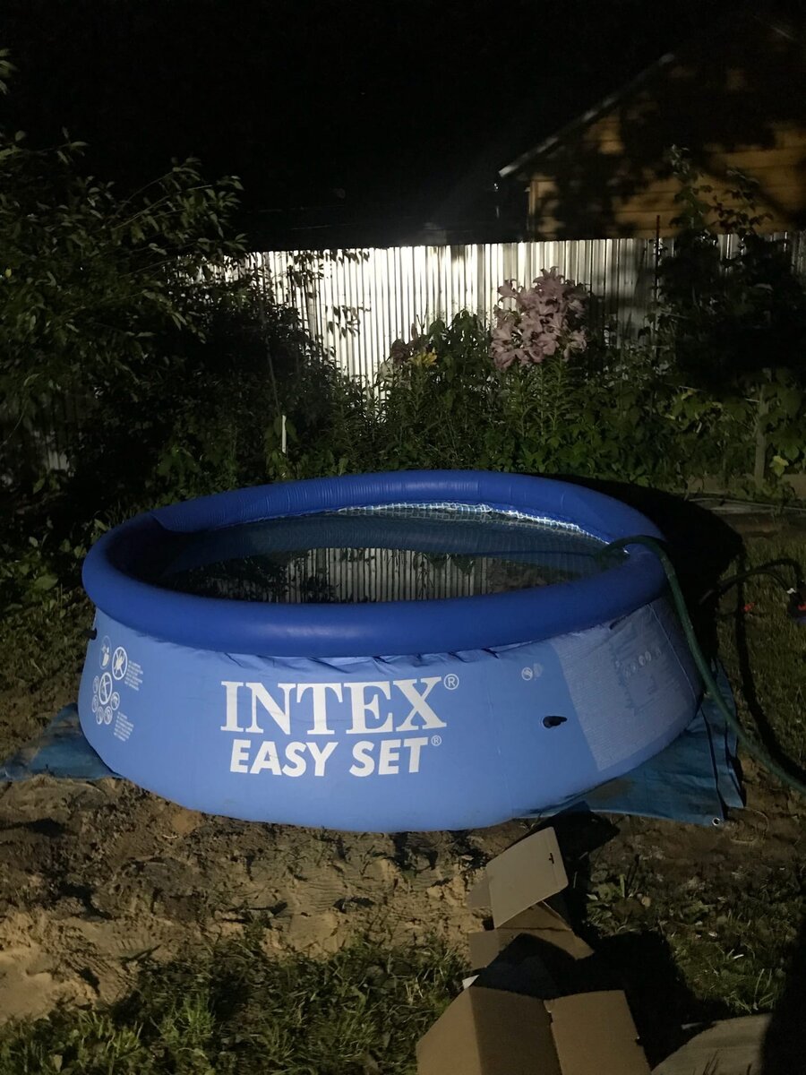 Приветствую всех любителей дачного отдыха. Это лето было не таким жарким как хотелось бы, но отдельные дни и недели были весьма невыносимыми. Как же спастись от назойливой жары и получить удовольствие? Раз вы здесь, то пришли к тому же решению, что и я, а именно - установить бассейн. Мой выбор остановился на надувном бассейне INTEX EASY SET, его можно легко и быстро собрать, так же быстро сдуть и убрать на полку. Для того, чтобы установить бассейн необходимо сделать следующее. Разберем по пунктам. Первое, выравниваем участок земли, на котором будет располагаться бассейн. Используем для это лопату, грабли, землю, песок, строительный "уровень". Убираем все камни и острые предметы (под давлением воды они могут проткнуть дно, нам этого не надо) Второе, на выровненном участке стелится полотно-брезент. Я купил такое на строительном рынке, который находится рядом с моей дачей. Третье, достаем бассейн, распрямляем и кладем на наше полотно. Далее, мы надуваем борта. Для этого используем насос