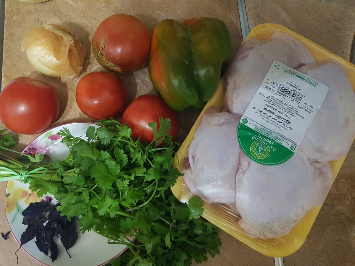 Ингридиенты: Курица -1кг.200гр.(мы взяли бёдрышки). Болгарский перец -1шт. Помидоры-4шт. Картофель-5шт. Кинза -1/2пучка. Лук-1шт. Соль, перец ,базилик красный сушеный. Масло подсолнечное-50гр. Готовим: Овощи моем,чистим Помидоры очищаем от шкурки,методом заливаем их кипятком. Курицу моем ставим варить,наливаем 1л200мл воды,солим и ставим на плиту.На вторую комфорку ставим кастрюлю побольше наливаем масло,включаем ,пусть греется.Параллельно овощи режем .Лук мелко режем средними кубиками,ложим в кастрюлю с маслом,пережариваем,не до обычной зажарки как обычно мы делаем, до коричневого состояния, обжариваем.Далее добавляем болгарский перец порезаный кубиками. Жарим лук с перцем 5 минут,добавляем чищенные помидоры порезаные кубиками. Помидоры жарим до состояния кашицы примерно примерно 7 мин..Далее добавляем картофель,режем крупными ломтиками ,жарим 5 минут. И так наша курица сварилась.Берём поварёшку и переливаем потихоньку бульон и мясо. Перелив все к нашим тушёным овощам,ждем ,когда