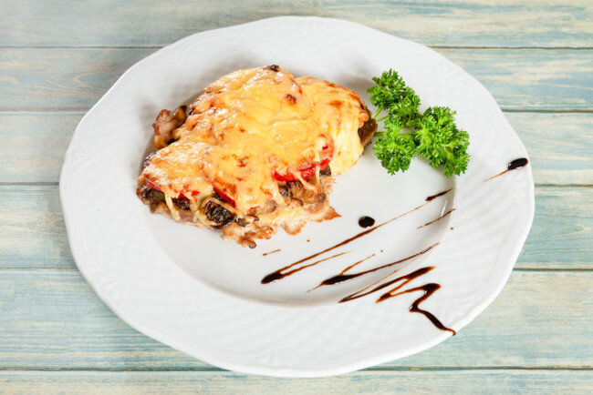 Если не хватает сочности и нежности, можно к обязательному набору продуктов при запекании добавить соус. Лучший вариант — бешамель. Но можно и обычный томатный. Как уже упоминалось, в домашней кухне эксперименты приветствуются.