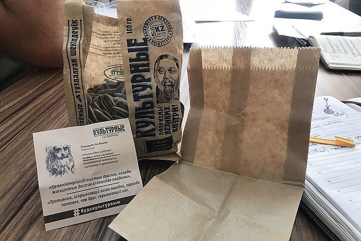 Больше всего нареканий от более-менее образованных любителей семечек может вызвать изображение великого казахского мыслителя Абая Кунанбаева на лицевой части пакета.