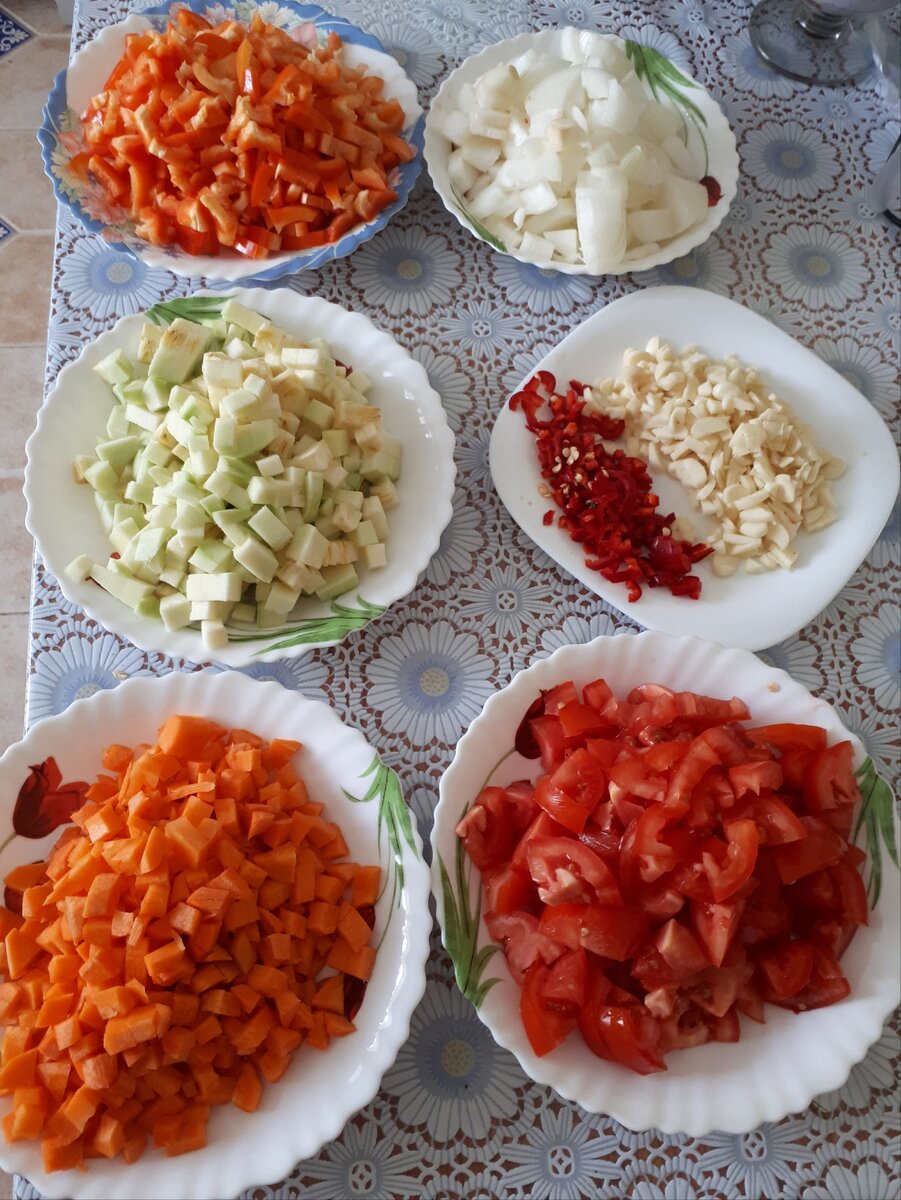 В прошлом году я начала готовить салаты в августе месяца, пока овощи есть в магазине, выбор большой, можно начинать готовить салаты на зиму. Сегодня я напишу как я готовила салат из фасоли. Купила фасоль, перец болгарский, помидоры, лук репчатый, морковь, чеснок, перец чили, один маленький кабачок. Фасоль замачивала с вечера, утром поставила варить. Как закипело, первую воду слила, хорошо промыла, добавила воды и поставила варить. Пока варится фасоль начала готовить овощи, помыла, почистила кожуру моркови, лук почистила, перец болгарский, удалила плодоножку и семена, помидоры помыла. Все овощи нарезала кубиками, лук полукольцами, и сложила все начинки в отдельную тарелку.