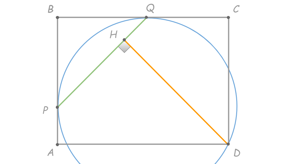 Окружность проходит через вершину D и касается сторон AB и BC в точках P и Q соответственно.